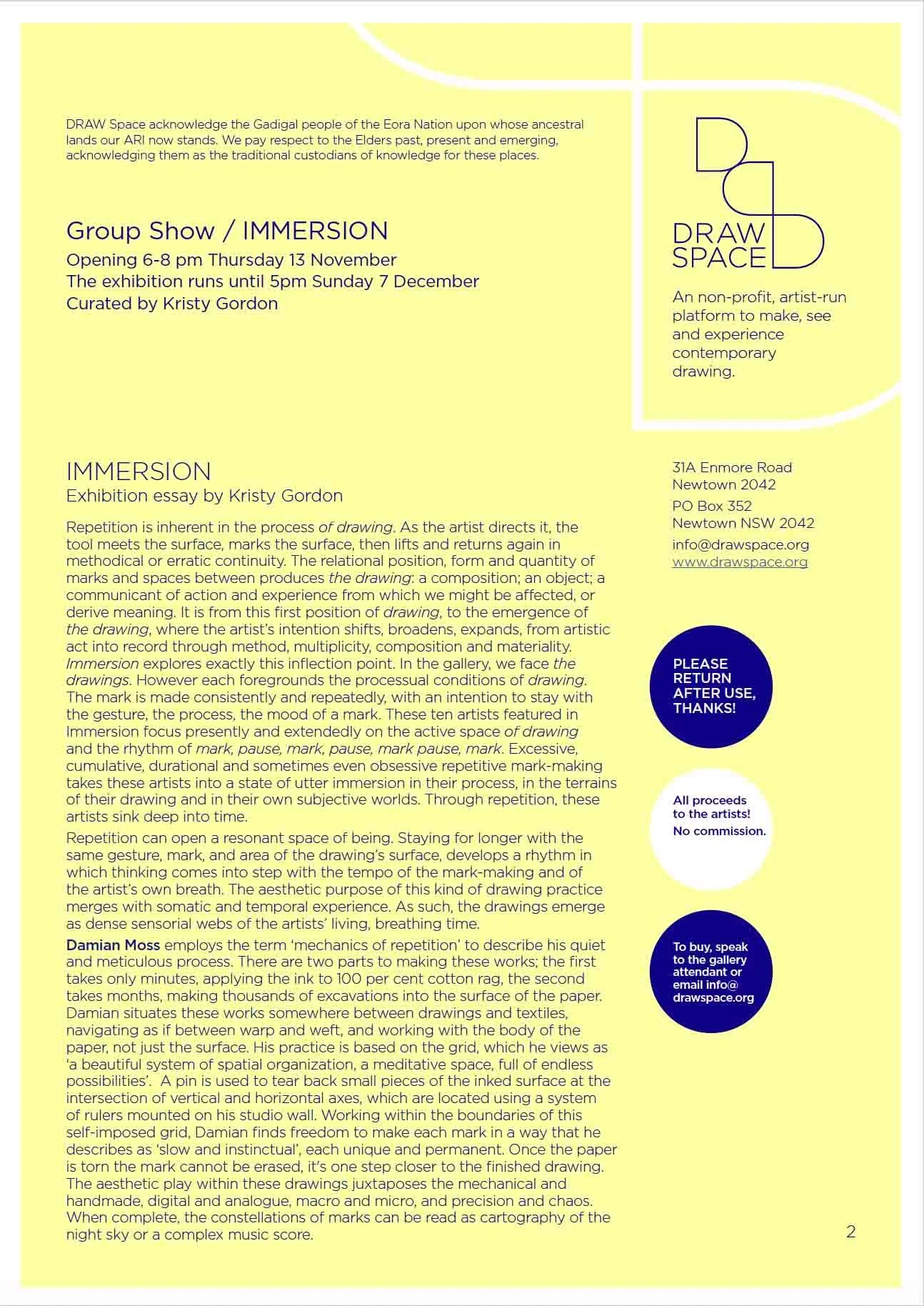 DRAW Space presents Group Show / IMMERSION. Opening 6-8pm Thursday 13 November until 5pm Sunday 7 December, Kristy Gordon (curator) and the DRAW Space board invite you to join the artists to celebrate.