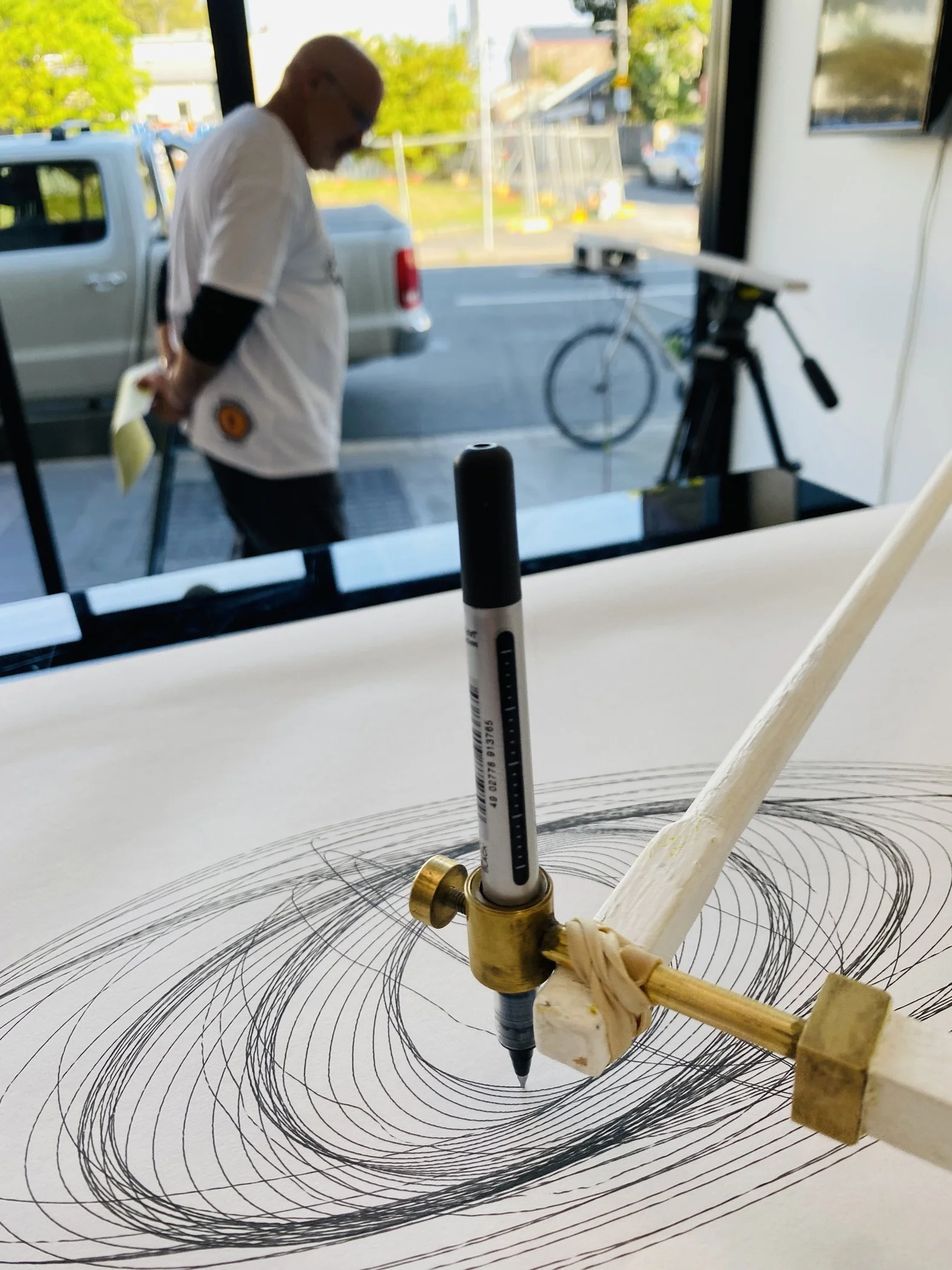 The drawing was produced by walking around the paper, tapping the pen, exploring the physics of the ad-hoc assembly and discovering rhythms and methods of mark-making with the experimental drawing instrument.