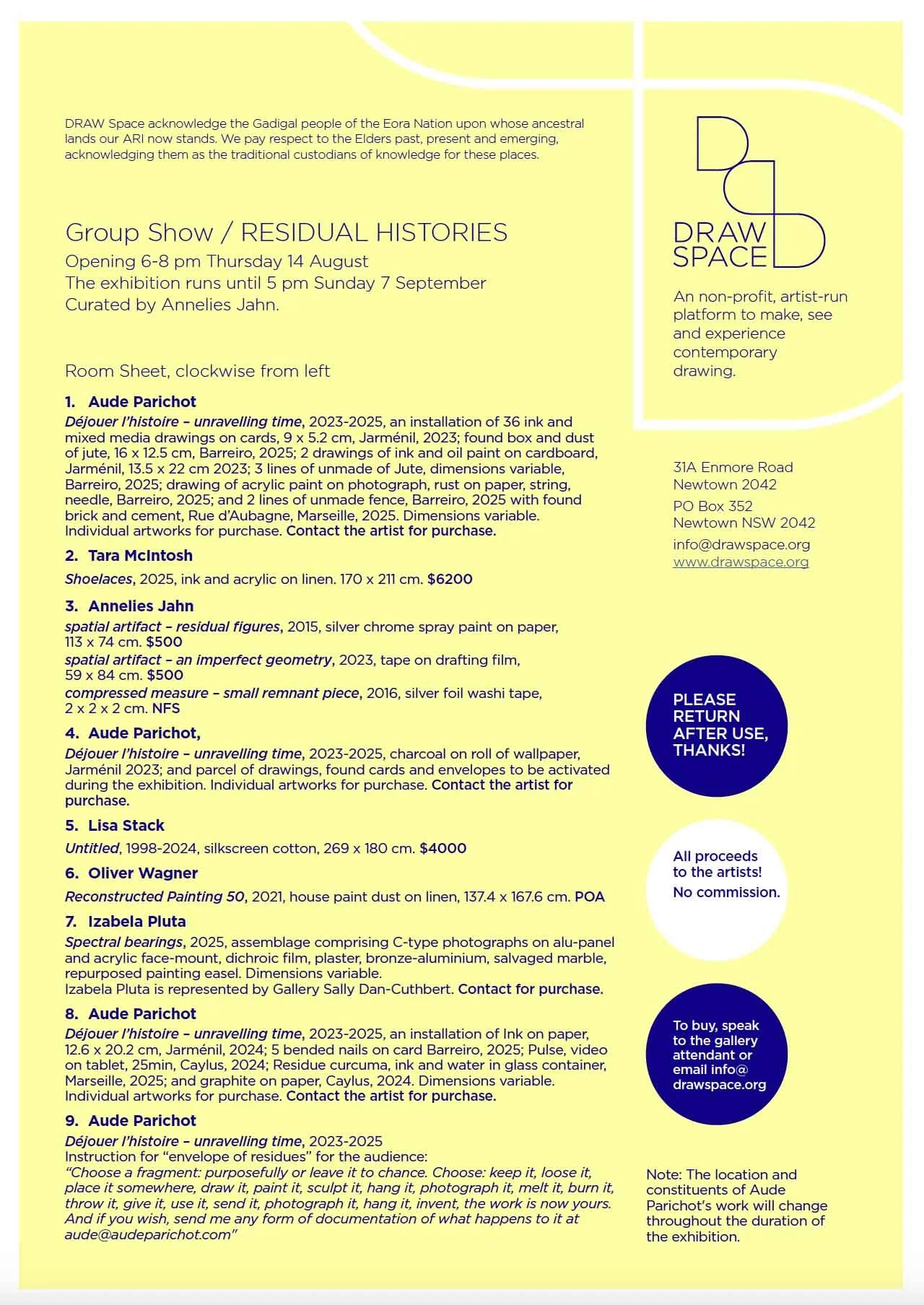 In August 2025, DRAW Space was delighted to present Group Show / RESIDUAL HISTORIES. Curated by Annelies Jahn, the exhibition opened at 6pm, Thursday 14 August and closed on Sunday 7 September. The exhibition featured the work of Annelies Jahn, Tara McIntosh, Aude Parichot, Izabela Pluta, Lisa Stack and Oliver Wagner.