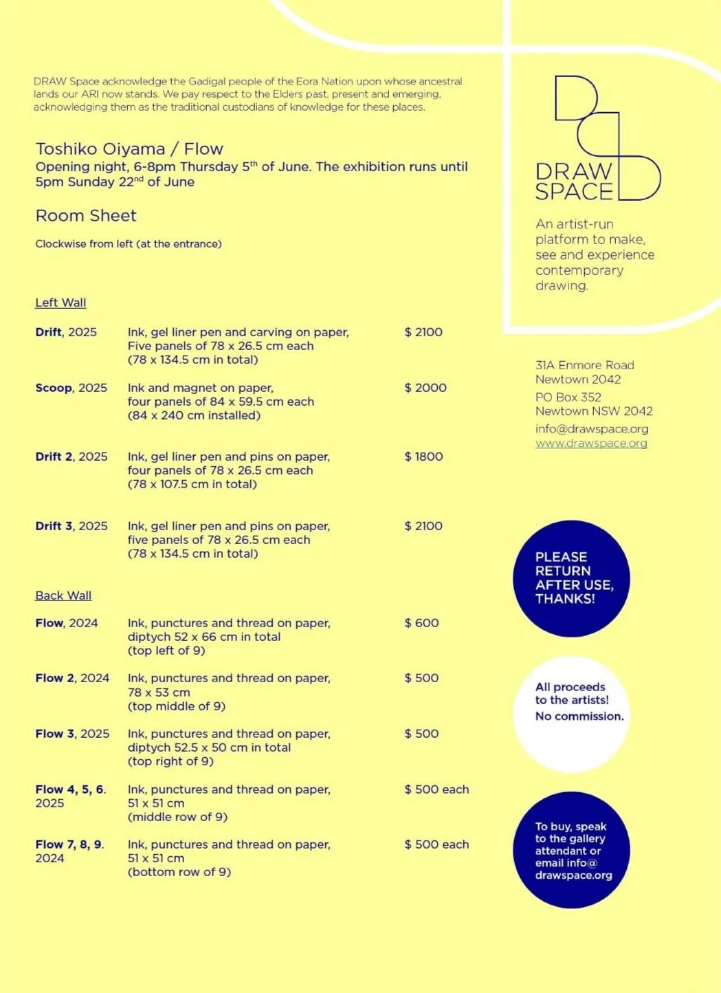 Toshiko Oiyama’s FLOW drawings are contemporary abstractions so rather than readable symbolism or overt imagery we have the works themselves, the ink on paper, the processes they reveal, and of course the artist’s conception and dialogue as guide. It is a practice of invoking transience with a material touch. In her handsbreadth, ink is the flow, and paper the inkcourse.